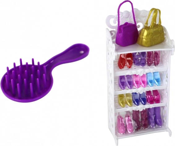 Das gesamte Set enthält auch einen weißen Schrank für Schuhe und Handtaschen, eine rosa Haarbürste zur Pflege der langen blonden Haare der Puppe, alles verpackt in der Originalverpackung mit den Maßen 32 cm x 21 cm x 6 cm.