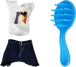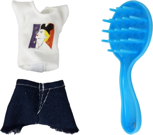 T-Shirt mit Print, Jeansröckchen, rosa Handtuch und Mini-Fläschchen fürs Kosmetikspiel – alles an einem Ort für abwechslungsreiche Geschichten.