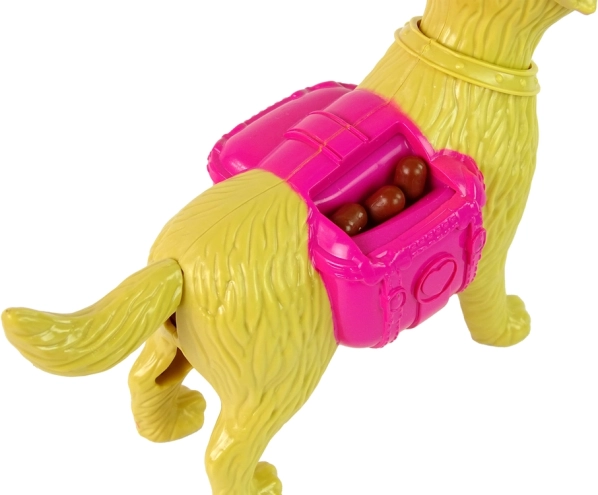 Der gelbe Hund hat einen beweglichen Schwanz, Ohren und ein Maul. Dank des rosa Vorratsbehälters und des Napfs mit Futterkügelchen kannst du ihn immer wieder füttern und deine Fantasie entfalten.