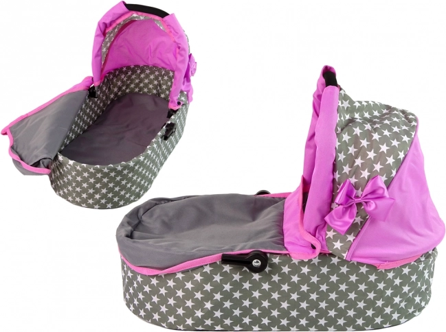 Der Kinderwagen kombiniert die Farben Rosa und Grau mit einem Sternenmuster, was dem Mutterspiel ein realistisches Aussehen verleiht.