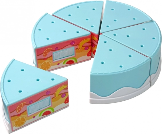 Die Torte besteht aus sechs dreieckigen Stücken, die sich dank Klettverschluss leicht schneiden und wieder zusammenfügen lassen. Realistisches Spiel ganz ohne scharfe Kanten und ohne Unordnung.