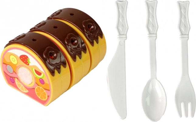 Das Kunststoffmesser und das Besteck sind für kleine Kinder ausgelegt. Beim Schneiden und Servieren entwickeln sie Feinmotorik, Koordination und soziale Fähigkeiten.