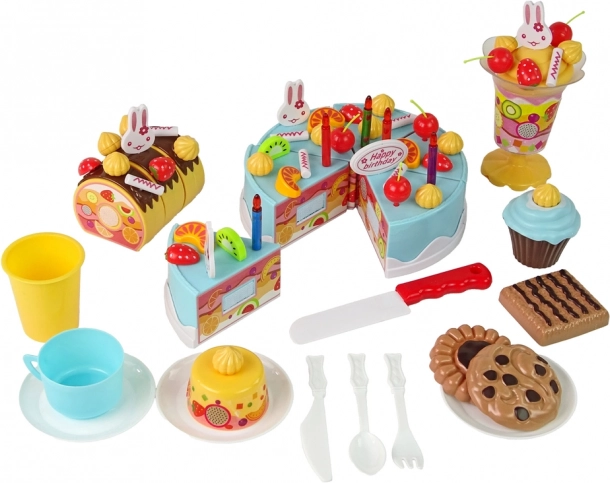 Torte (6 Stücke), Topper, Kerzen, 3× Keks, Stück Kuchen, Eisbecher, Muffin, Tasse, 3× Teller, Kunststoffmesser