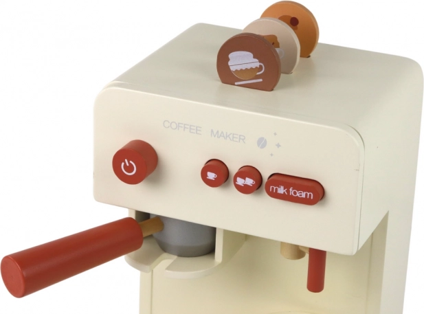 Diese Kaffeemaschine aus Holz ahmt ein echtes Gerät realistisch nach, sodass sich Kinder wie echte Baristi fühlen können. Die Bedienung umfasst eine „Einschalt“-Taste, die Auswahl von einer oder zwei Tassen sowie die Funktion zum Milchaufschäumen, was Fantasie und das Nachspielen alltäglicher Handlungen fördert.