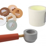 Enthalten sind eine Tasse, ein Siebträger und 6 Kapseln mit Getränkemotiven. Kinder stellen sich leicht ihre eigene „Getränkekarte“ zusammen und üben sowohl das Bedienen von Gästen als auch die Feinmotorik.