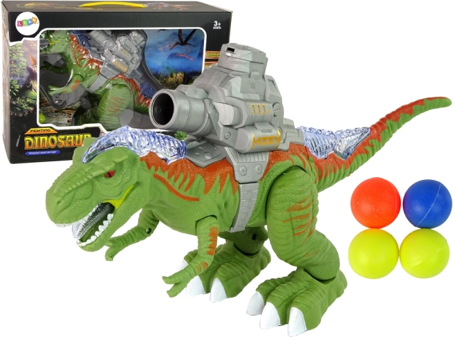 Entdecken Sie ein großartiges Actionspielzeug für kleine Urzeit-Fans. Dieser grüne Dinosaurier besteht aus robustem Kunststoff, kann sich bewegen, leuchtet am Kopf und am Schwanz, und aus dem Maul ertönen realistische Geräusche. Auf seinem Rücken befindet sich ein Magazin mit Katapult, das die Kugeln automatisch ungefähr alle 10 Sekunden abfeuert – ideal für dynamische Spielszenarien.
