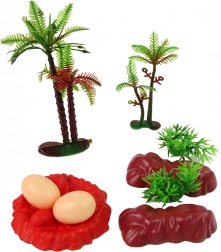 Zum Set gehören Accessoires wie zwei Steine, zwei Büsche, zwei Bäume und zwei Dinosauriereier, die eine realistische Gestaltung eigener prähistorischer Szenen ermöglichen.