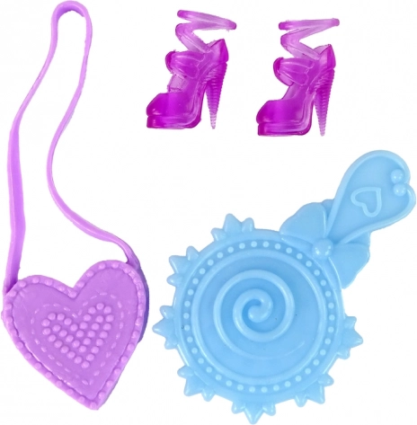 Das Set umfasst rosa High Heels, eine Herztasche und ein rundes blaues Accessoire – alles passend zum Outfit der Puppe und zur Erweiterung der Spielmöglichkeiten.