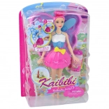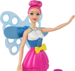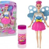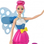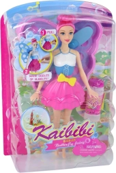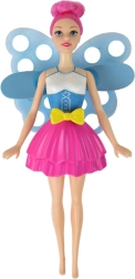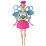 Puppe mit rosafarbenem Haar und blauen Flügeln, die wie eine echte Fee aussieht.