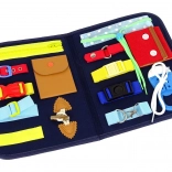 Das Brett bietet verschiedene Verschlussarten und Aktivitäten, die die Feinmotorik fördern und die Selbstständigkeit der Kinder unterstützen.