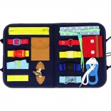 Das Brett enthält eine Reihe von Elementen in verschiedenen Formen und Texturen, die helfen, das haptische Empfinden zu verbessern. Es enthält verschiedene Verschlussarten wie Knöpfe, Schnallen und Schnürungen, die die kindliche Kreativität anregen und das selbstständige Bewältigen von Alltagssituationen fördern.