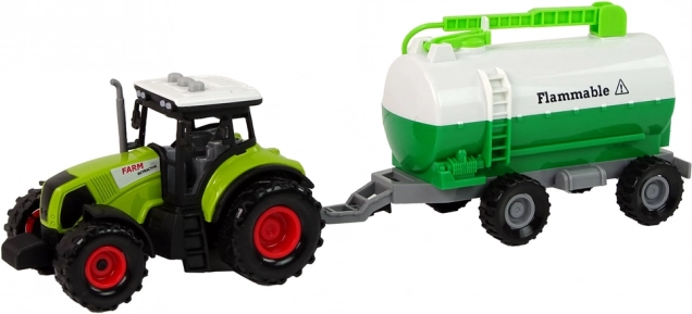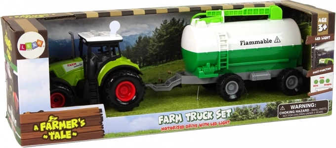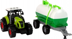Das Spielzeug ist überwiegend grün – eine Farbe, die wir mit diesem Fahrzeugtyp verbinden. Zum Set gehören ein Traktor und ein Tankanhänger, was das Spiel abwechslungsreicher macht. Der Traktor selbst kann fahren und charakteristische Geräusche erzeugen. Die Hinterräder ermöglichen dank Handantrieb die Bewegung des Fahrzeugs vorwärts oder rückwärts – je nach Wunsch. Für die Soundeffekte verfügt der Traktor über 3 Tasten auf dem Dach. Diese Tasten geben Geräusche wie Rückwärtsfahren, Hupen und Starten wieder. Um die Geräusche zu hören, muss die weiße Kunststoffsicherung herausgezogen werden. Im Set ist ein Anhänger mit Zisterne enthalten, der je nach Spielwunsch des Kindes an der Rückseite des Fahrzeugs befestigt werden sollte. Der Anhänger hat grüne Elemente, die geöffnet oder nach oben geklappt werden können.