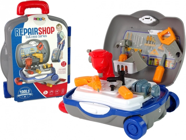 Der Koffer verwandelt sich geöffnet in eine Mini‑Werkstatt mit Arbeitsfläche. Nach dem Spielen lassen sich alle Teile leicht verstauen – so ist im Nu wieder Ordnung.