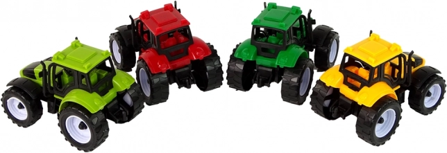 Das Set enthält Traktoren in vier Farben: Dunkelgrün, Hellgrün, Orange und Rot.