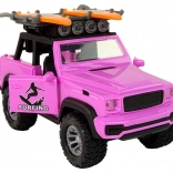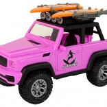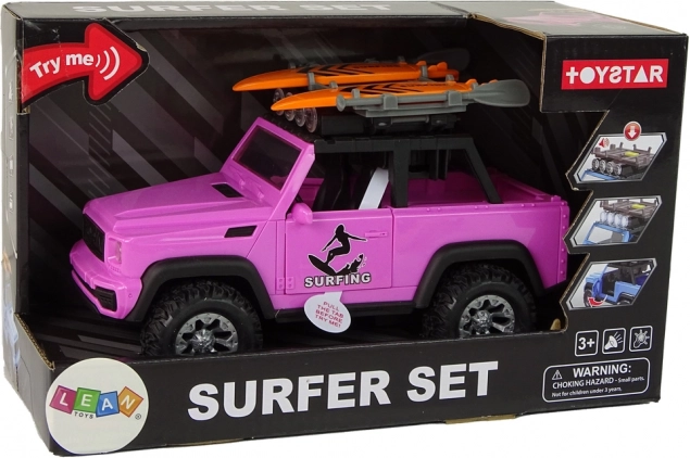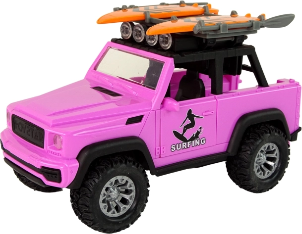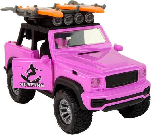 Genießen Sie Sommerfeeling mit dem rosa Offroad-Fahrzeug im Surf-Thema. Realistische Details, große Räder und der Schwungradantrieb sorgen für eine ruhige Fahrt, während Lichter und Sounds jede Fahrt in ein Abenteuer verwandeln. Surfbretter und Paddel auf dem Dachträger regen die Fantasie an und laden zu Strandgeschichten ein.