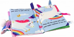 Es enthält 8 Seiten, die mit lebendigen und ansprechenden Farben gestaltet sind, die dank Elementen, die verschiedenen Körperteilen der Einhörner entsprechen, zum Leben erwachen. Für einfaches Verstauen und Transport ist das Buch mit einem Klettverschluss ausgestattet, der die Seiten an Ort und Stelle hält.