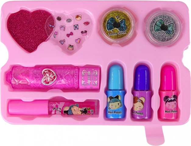 Drei Nagellacke in Blau, Lila und Rosa lassen Sie mit unterschiedlichen Farbtönen experimentieren und trendige Nageldesigns kreieren. Der rosa Lippenstift und der rosafarbene Lipgloss in der Tube schenken den Lippen einen schönen Hauch Farbe.