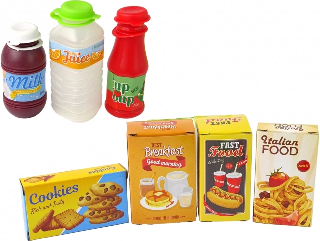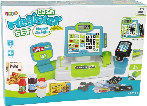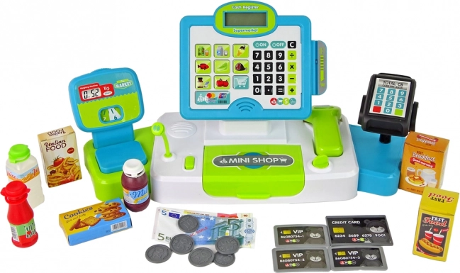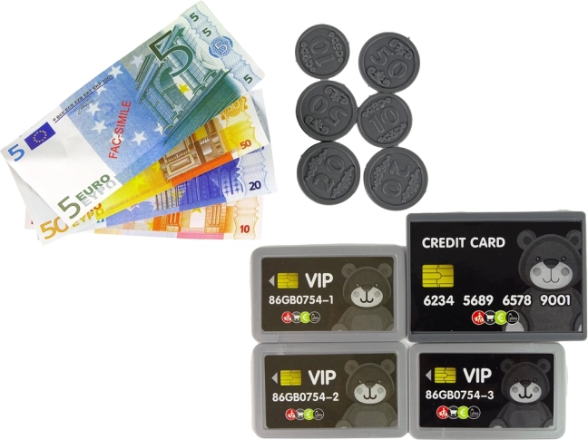 Zum Set gehören auch Geld, Karten und verschiedene Produkte, die es den Kindern ermöglichen, Einkäufe zu simulieren und mathematische Fähigkeiten zu entwickeln.