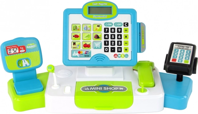 Enthält verschiedene interaktive Elemente wie Waage, Terminal und Scanner. Das Spielzeug ist so konzipiert, dass es die Entwicklung manueller Fähigkeiten und Vorstellungskraft fördert.