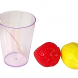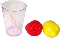Im Set enthalten sind Tassen, Untertassen, ein Glas, ein Löffel und niedliches Obst – Erdbeere und Zitrone – für stilvolles Servieren.