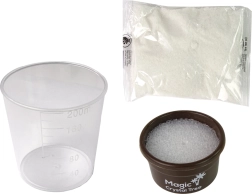 - Messlöffel (Messbecher), Kristallpulver, Rührstab, „Samen“ der Kristalle (Baumgrund), Lupe, Blumentopf, runder saugfähiger Filter, Holzplättchen