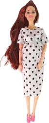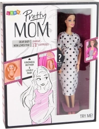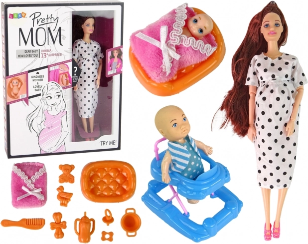 Wir präsentieren die faszinierende Schwangere Puppe, die kleine Liebhaber von kreativem Spiel und Familienpflege begeistert. Die Puppe hat lange braune Haare und ein elegantes weißes Kleid mit schwarzen Punkten, ergänzt durch rosa Schuhe.