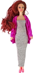 Schwangere Puppe mit tollen Accessoires, ideal für Kinder, die gerne Eltern spielen! Die Puppe hat lange braune Haare, blaue Augen und ist in einem grauen Kleid mit rosa Pullover und rosa Schuhen gekleidet.