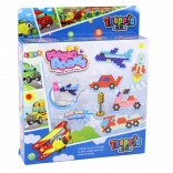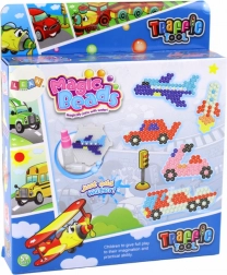 Das Set bietet 8 Farben (Gelb, Orange, Rosa, Rot, Schwarz, Weiß, Dunkelblau, Blau), zwei transparente Steckplatten mit Noppen (Quadrat und Sechseck), eine Pinzette, einen Applikator, einen Sprüher, 4 Aufhängeringe sowie ein Vorlagenheft – die perfekte Wahl für Einsteiger und kleine Kreative, die Verkehrs-Motive lieben.
