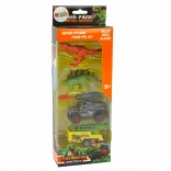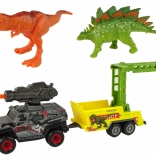 Dieses Dinosaurier-Set versetzt Kinder in die Welt längst vergangener Zeiten. Enthalten sind ein TYRANNOSAURUS in braun-orangen Tönen und ein STEGOSAURUS in Grün mit markanter orangefarbener Rückenreihe. Der Geländewagen ist mit einem Raketenwerfer mit beweglichem Geschoss und einem Anhänger mit Metallgittern für den sicheren Transport der „prähistorischen“ Kreaturen ausgestattet.