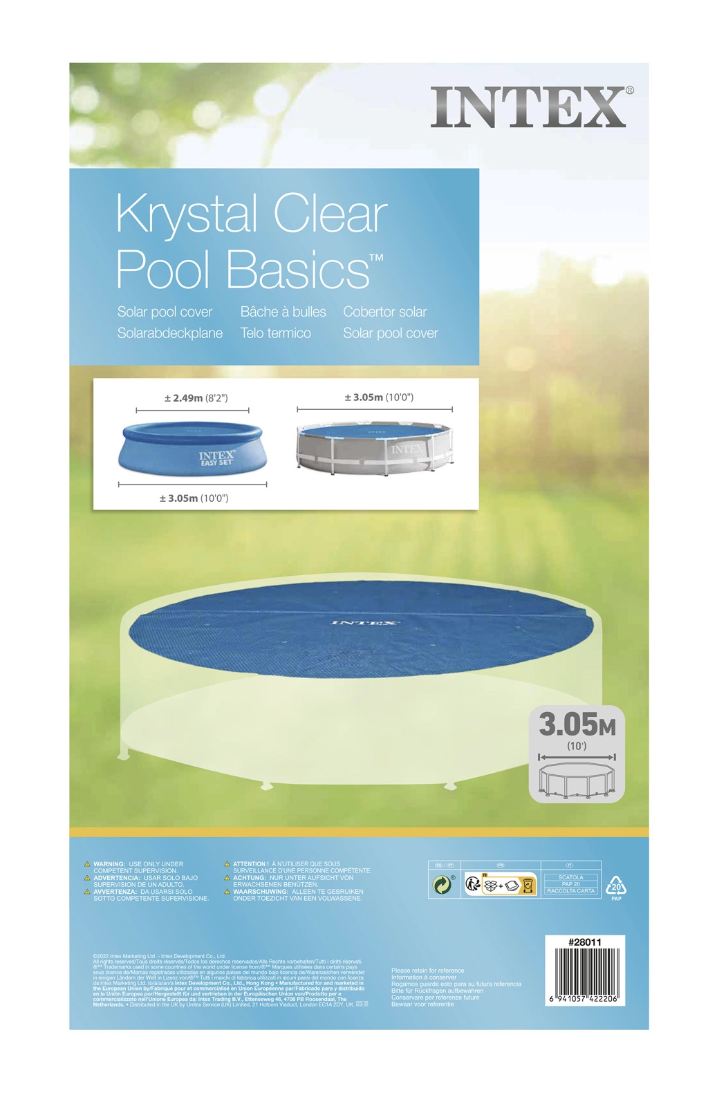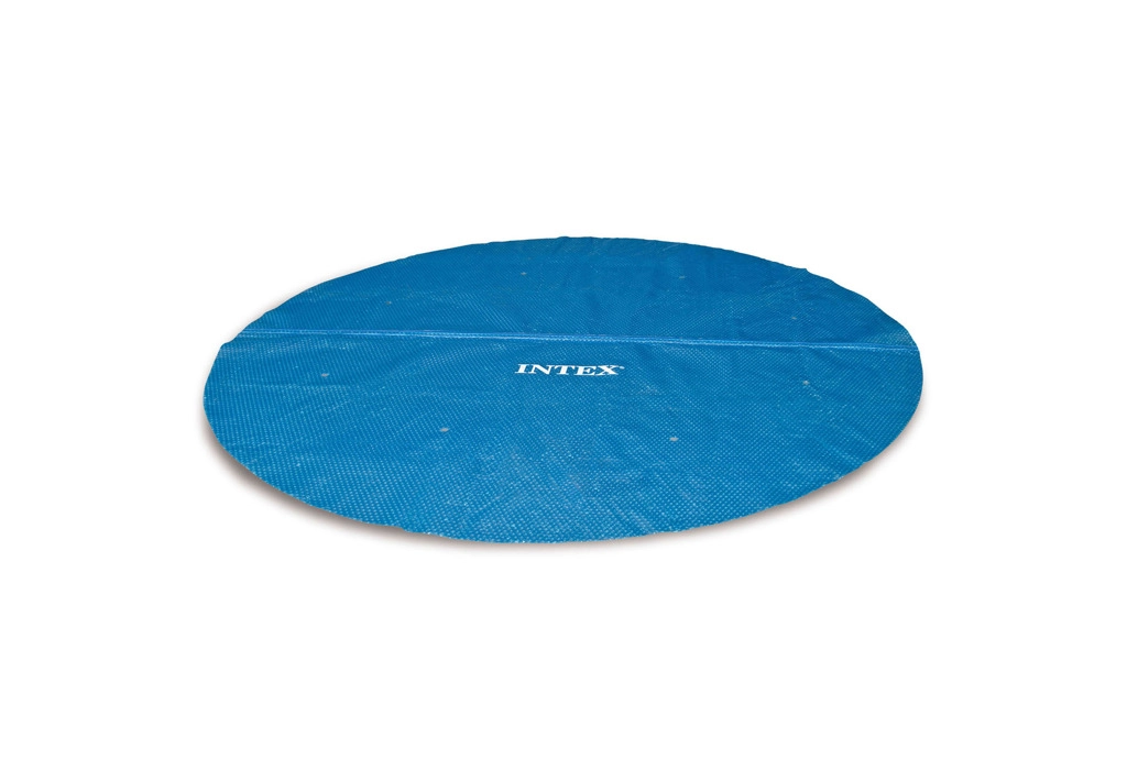 Praktische INTEX-Solarplane für runde Pools mit einem Durchmesser von 305 cm. Sie erwärmt und hält die Wassertemperatur effektiv, reduziert Wärmeverluste über Nacht und schützt die Wasseroberfläche vor Laub und Schmutz. Dank der Noppenstruktur lässt sie Sonnenstrahlen durch und verbessert die Wasserisolierung.