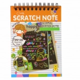 Mithilfe des im Set enthaltenen speziellen Holzstäbchens können Kinder durch Kratzen der Oberfläche zeichnen und schreiben. Darunter kommt eine kontrastierende Farbschicht zum Vorschein, die effektvolle Muster, Formen und Bilder entstehen lässt.