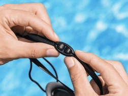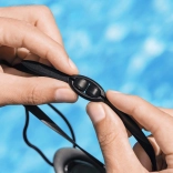Weiche Silikonauflagen schließen sicher am Gesicht ab und verhindern das Eindringen von Wasser. Das verstellbare Silikonband mit Schnellregulierung und der bequeme Nasensteg ermöglichen einen präzisen, stabilen Sitz bei jedem Zug.