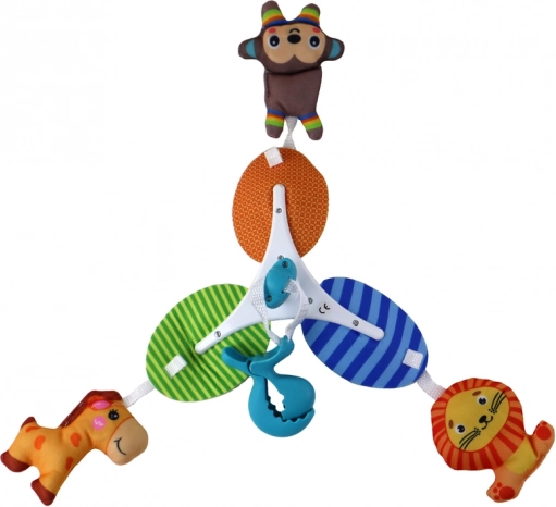 Das Set enthält drei plüschige, bunte Tiere: eine Giraffe, einen Löwen und ein Äffchen. Diese sind weich im Griff und kindgerecht. Ihre leuchtenden Farben ziehen die Aufmerksamkeit der Kinder auf sich und fördern die sensorische Entwicklung.