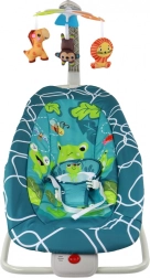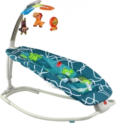 Dieses Produkt enthält weiße Sicherheitsgurte zur Sicherstellung der Sicherheit Ihres Kindes. Betrieben durch zwei 1,5 V Batterien (nicht im Lieferumfang enthalten) und bietet verschiedene Unterhaltungsmöglichkeiten, einschließlich Liedern und Vibrationen, die dem Kind helfen, sich zu entspannen und einzuschlafen. Farbige Kombinationen aus Grün und Blau schaffen eine freundliche Umgebung. Die Liege kann auch in einen stabilen Sitz verwandelt werden, indem man das weiße Bein ausklappt.