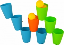 Das Stapeln der Becher und das Werfen mit den gelben Bällen unterstützt die Entwicklung manueller Geschicklichkeit und die Hand-Auge-Koordination bei Kindern.