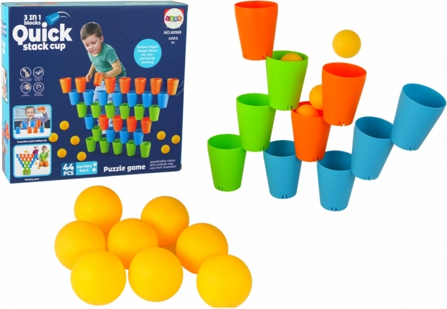 Das Set enthält Becher in drei Farben: orange, grün und blau mit gelben Bällen für spielerisches Ordnen und Stapeln.