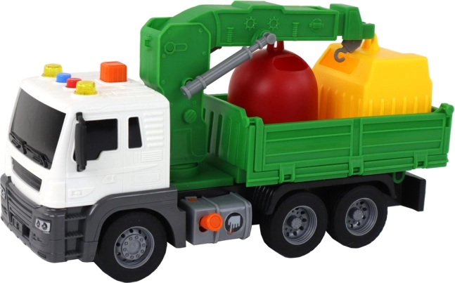 Der Hebearm auf dem Dach wird per Knopfdruck gesteuert. Zwei Behälter und Kärtchen mit Abfallarten unterstützen spielerisch das Lernen der Mülltrennung.