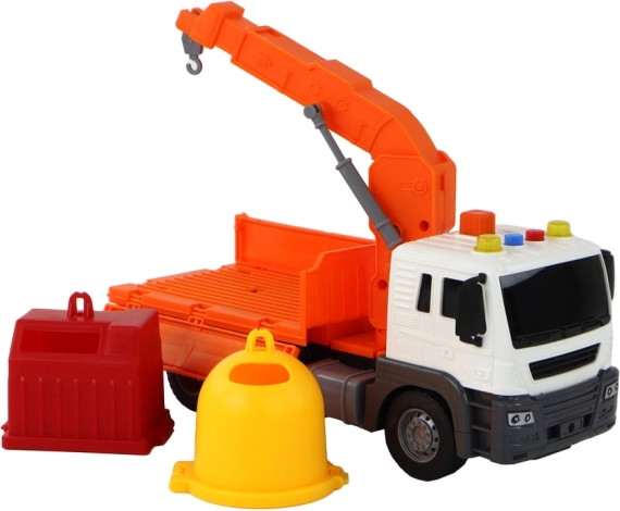 Ein weiteres Highlight ist der auf dem Dach des Lkw angebrachte Kran. Beim Drücken der orangefarbenen Taste hebt sich der Kranarm – ein interaktives, kreatives Element für das Spiel. Das Kind kann Container anheben und absenken und Szenen des Sammelns und Sortierens von Abfällen nachspielen.