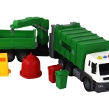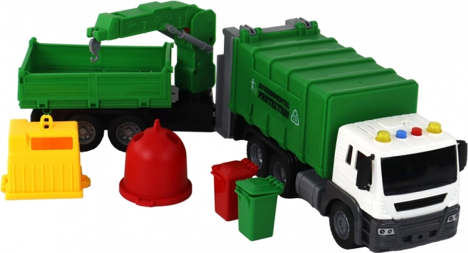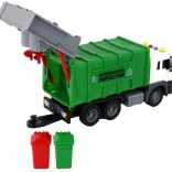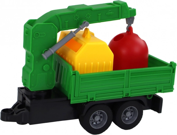 Eine weitere interessante Besonderheit ist der Anhänger mit Kran. Der Ausleger lässt sich anheben und bringt ein interaktives und kreatives Element ins Spiel. Das Kind kann Container heben und senken und Szenen des Einsammelns und Sortierens von Abfällen nachspielen.