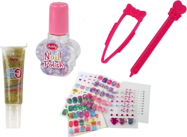 Das Set enthält Lack, Glitzer, Aufkleber und Werkzeuge für die einfache Anwendung, damit Kinder einzigartige Nageldekorationen gestalten können.