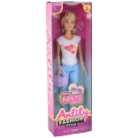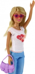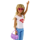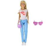 Die Puppe trägt ein weißes T‑Shirt mit Herz/Lippen-Motiv, blaue Hosen und weiße Sneakers. Die violette Handtasche und die rosa Sonnenbrille ermöglichen vielfältige stylische Kombinationen für jeden Anlass.