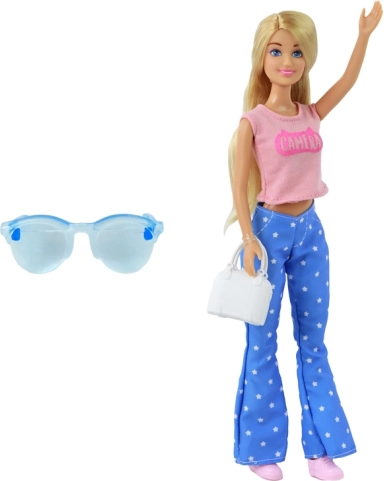 Im Set fehlen auch praktische Accessoires nicht – eine weiße Handtasche und eine blaue Sonnenbrille – die die Spielmöglichkeiten erweitern und die Fantasie fördern. Die kompakten Abmessungen sind ideal für zu Hause und unterwegs.