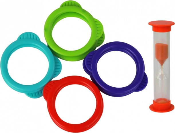 Das Set enthält Ringe in vier Farben und eine Sanduhr für eine schnelle Wettbewerbsrunde. Stellt die Zeit ein und versucht, so viele Ringe wie möglich aufzusetzen, bevor der Sand abgelaufen ist.