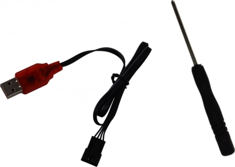 Im Lieferumfang ist alles für den sofortigen Start enthalten: Modell mit 7,4 V 500 mAh Akku, USB-Ladegerät, Sender und Aufkleber zur Personalisierung. Es werden lediglich 2× AA-Batterien für die Fernsteuerung benötigt.