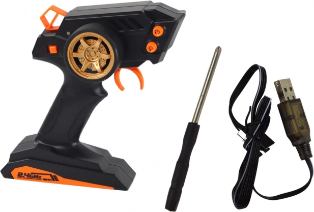 Die Pistolenfernbedienung mit Lenkrad auf 2,4 GHz gewährleistet stabile Reichweite, mühelose Manöver und eine störungsfreie Fahrt.
