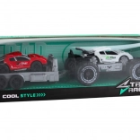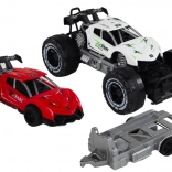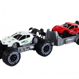 Dieses Spielzeugset enthält einen weißen Offroad-Wagen und einen roten Sportwagen auf einem Anhänger, der die Kreativität und Vorstellungskraft beim Spielen fördert. Kinder können ihre eigenen Geschichten voller Rennen und Abenteuer im wilden Gelände erfinden. Der Anhänger lässt sich einfach abnehmen, was neue Kombinations- und Spielmöglichkeiten eröffnet.