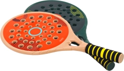 .Set aus 2 Padel-Schlägern für das Spiel Padel in eleganten Grün- und Cremefarben. Die Schläger bestehen aus hochwertigem Kunststoff, sind stabil und robust. Anstelle einer Bespannung (wie bei einem traditionellen Tennisschläger) gibt es eine Kunststofffläche mit Löchern.