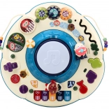 Die Hängetafel mit vier Figuren in vier verschiedenen Farben entwickelt die manuellen und logischen Fähigkeiten des Kindes, stimuliert Kreativität und Konzentration. In der oberen Ecke des Tisches befindet sich eine Trommel, um die sich die Tierchen drehen – das sorgt für Bewegung und zusätzliche Attraktivität.