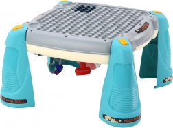 Der Tisch ist mit einem Karussell und Getrieben ausgestattet, die Kinder zur Bewegung und Erkundung motivieren.