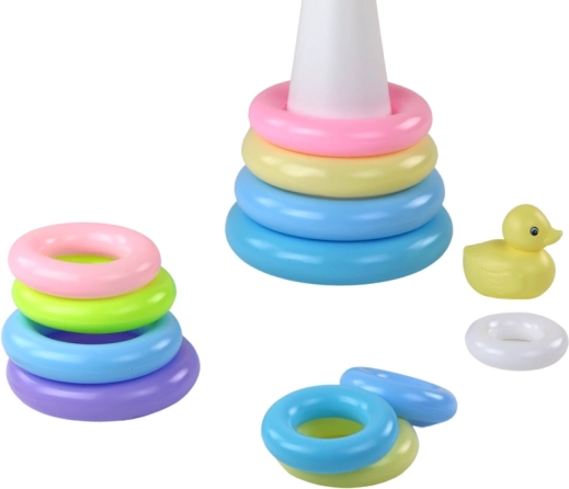 Kinder stapeln die Ringe vom größten zum kleinsten und lernen dabei Farben, Größen und Reihenfolgen kennen. Unterstützt das logische Denken und das räumliche Wahrnehmen.